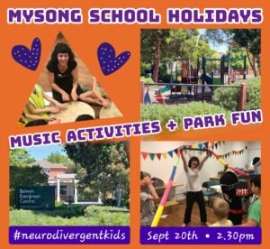 MySong Music Classes is inviting new and current families to their free school holiday afternoon of musical activities and park fun! September 20th 2.30pm. There is no cost, but bookings are essential due to limited numbers. For Neurodivergent kids ages 5-13. Join us for some musical activities in our usual music room, get to see what we are all about, meet other kids and families and, bring a snack to enjoy in the park out the front of the centre! Contact Jackie for further deets and bookings: jackiebornstein@hotmail.com